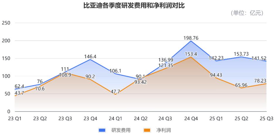 第三季度,比亚迪的研发费用为141.52亿元,同比增长3.31%。