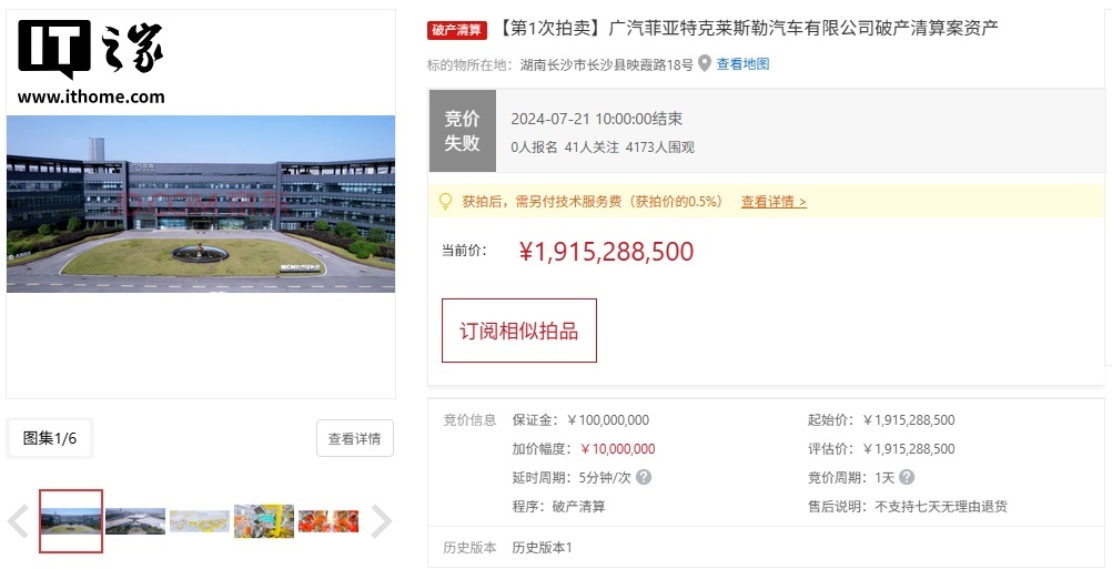 IT之家查询获悉,广汽菲克长沙工厂首次拍卖于 7 月 20~21 日进行,起拍价超 19.15 亿元,但因无人出价而流拍。