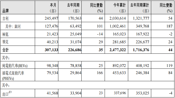吉利品牌作为核心品牌,2025年10月销量245,497部,去年同期170,563部,同比增长44%;2025年累计销量2,030,614部,去年同期累计1,321,777部,累计同比大幅增长54%,为整体销量增长提供核心支撑。