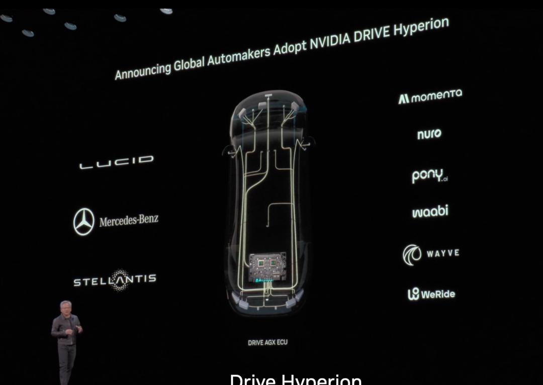于是,当天,黄仁勋还宣布,英伟达通过Hyperion 10平台与多家车企建立了深度合作,进一步扩展L4级自动驾驶生态,包括Stellantis、Lucid、奔驰等。