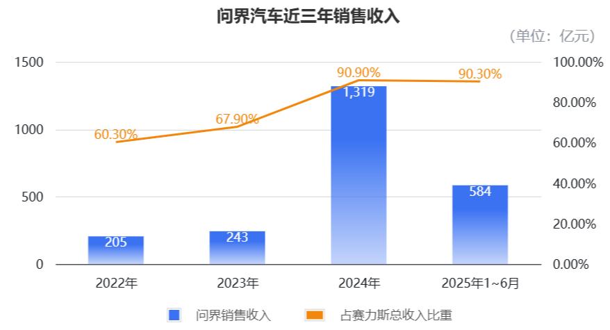 到2024年,随着问界销量爆发,这一比例骤然提升到了90.9%,今年上半年也仍维持着90.3%的高占比,成为赛力斯增长的主要支柱。