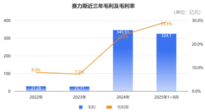 对应到营收上,2022年和2023年,赛力斯实现营收340.56亿元和357.89亿元;2024年猛涨到1451.13亿元,首次破千亿,且同比暴涨了305.5%。