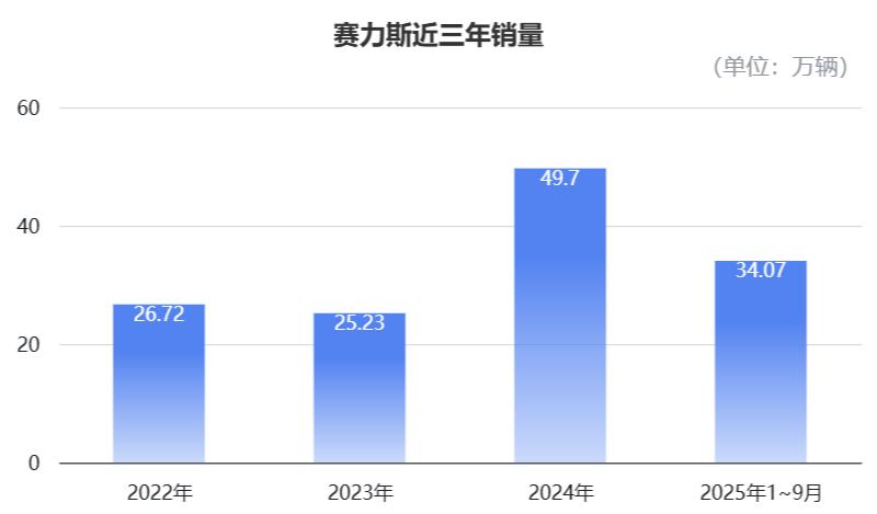 2022年到2024年,赛力斯的汽车销量分别为26.72万辆、25.23万辆和49.70万辆;其中2024年新能源汽车销量达42.69万辆,较2023年增长182.84%。
