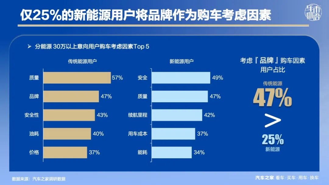 与传统能源市场不同,豪华品牌的品牌效应在新能源市场显得“力不从心”,即便是面向30万以上的高预算用户也难以发挥,主要是购车需求截然不同。在传统能源用户心中,品牌的价值仅次于对质量的考量,位居第二,选择占比达到47%,但在新能源用户心中都无法进入Top 5,仅有25%的用户选择。