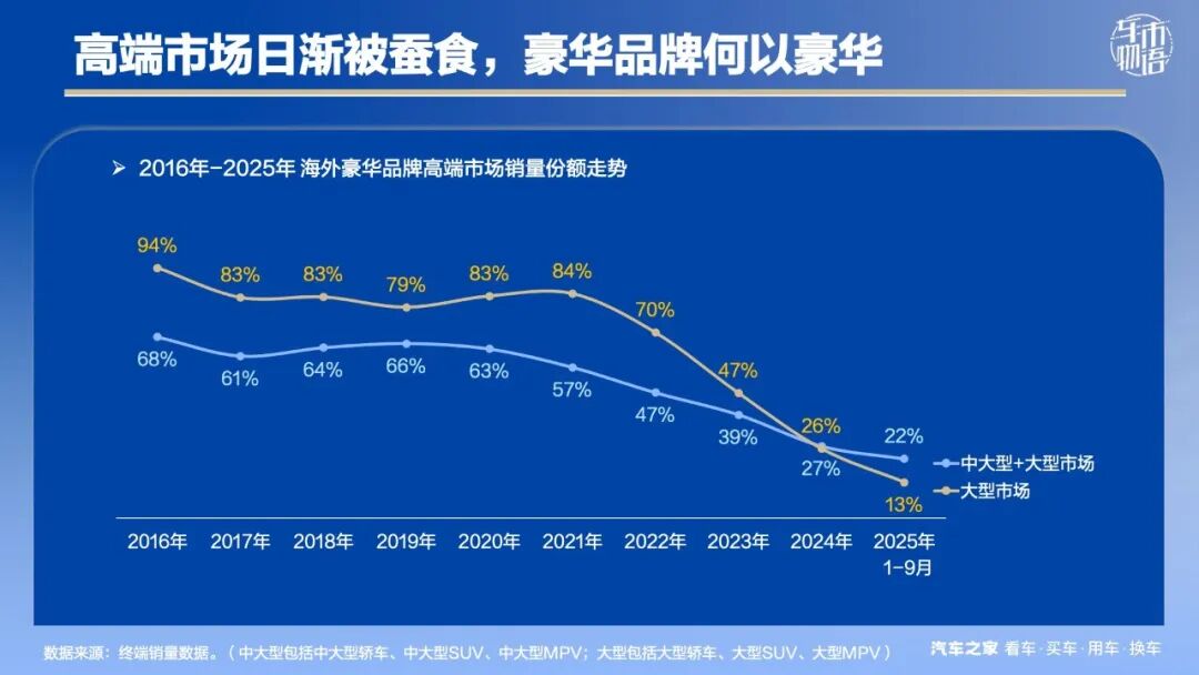 据终端销量数据显示,海外豪华品牌阵营在大型级别市场的市占率,由2016年94%的绝对王者,下降至13%。综合看中大和大型级别市场,在2016年还能保持68%的份额,2021年开始快速下行,至2025年1-9月仅剩22%。