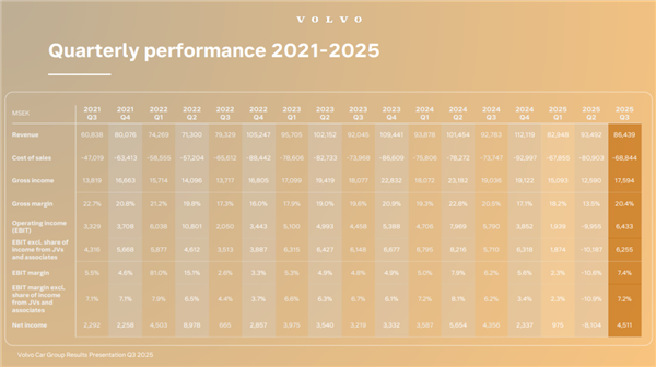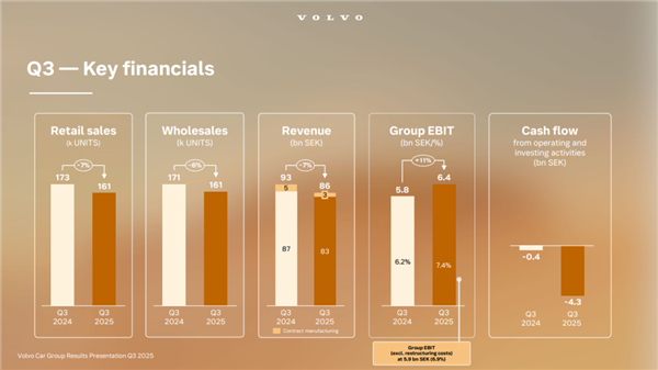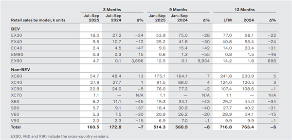 上周,沃尔沃汽车公布了 2025 年第三季度财报,销量为 160514,同比下降 7%,环比下降 11.6%。
