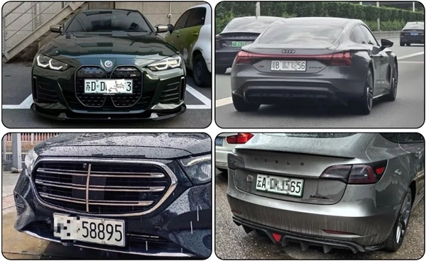 博主展示的图片显示,有特斯拉、奔驰E级插电、宝马/奥迪新能源车型,悬挂底色为白色的新能源车牌,除了底色不同外,其它与新能源车牌完全一致。