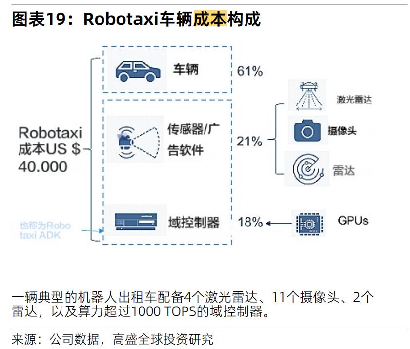成本方面,根据高盛测算,以4个激光雷达,11个摄像头,2个毫米波雷达,控制器算力超1000TOPS的标准Robotaxi车辆为例,其车辆成本占比61%,激光雷达、雷达、摄像头成本占比21%,控制器成本占比18%。
