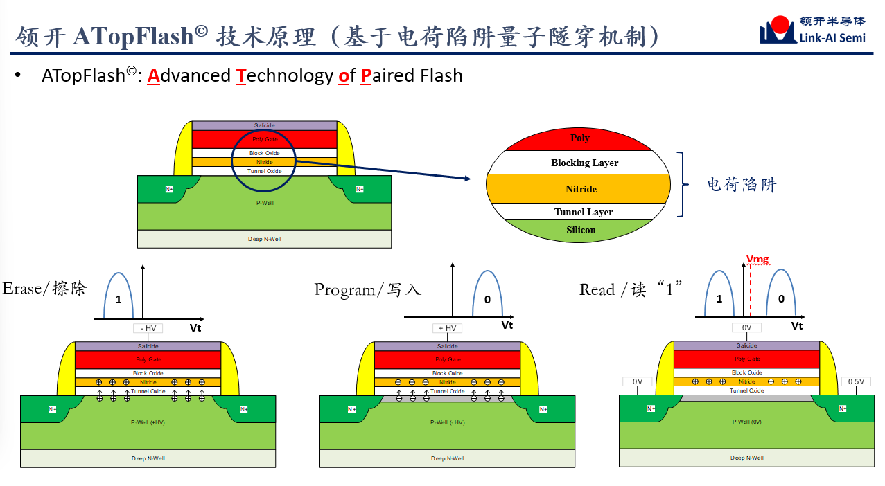 -单元更小:ATopFlash©小于1T1b,省去了不利于微缩的高压NMOS选择管;