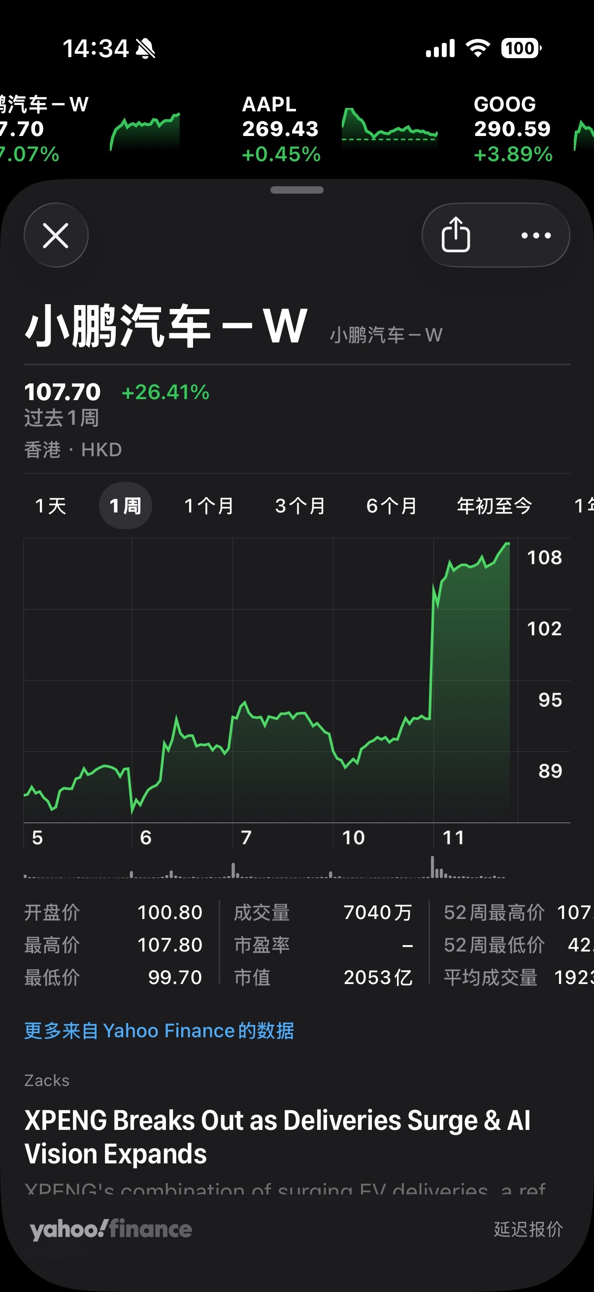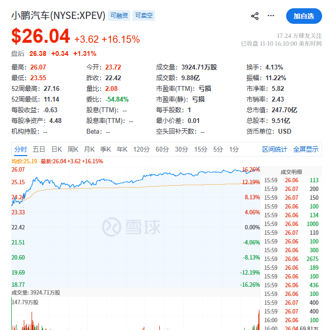 凤凰网科技讯 11月11日,截至发稿,小鹏汽车港股上涨16.74%,报107.4港元;美股昨日收盘涨16.15%,盘后又上涨1.31%,报26.04美元。受对其机器人的乐观情绪提振,过去一周,小鹏汽车累涨26.41%。