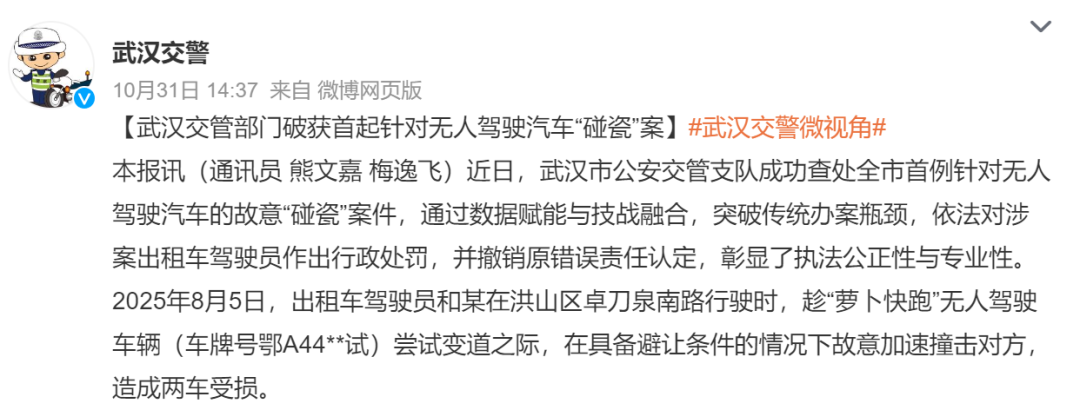近期,武汉出现首例出租车针对无人驾驶汽车萝卜快跑的故意“碰瓷”案件,在这一案件的侦办过程中,萝卜快跑车辆详实的算法日志与云端数据,成为指认出租车“异常加速”的首要证据。这标志着,在未来涉及智能网联汽车的事故中,最可靠的“证人”可能是由代码生成的运行数据。这要求相关法律法规与时俱进,出台针对自动驾驶汽车的相关监管和责任划分标准。