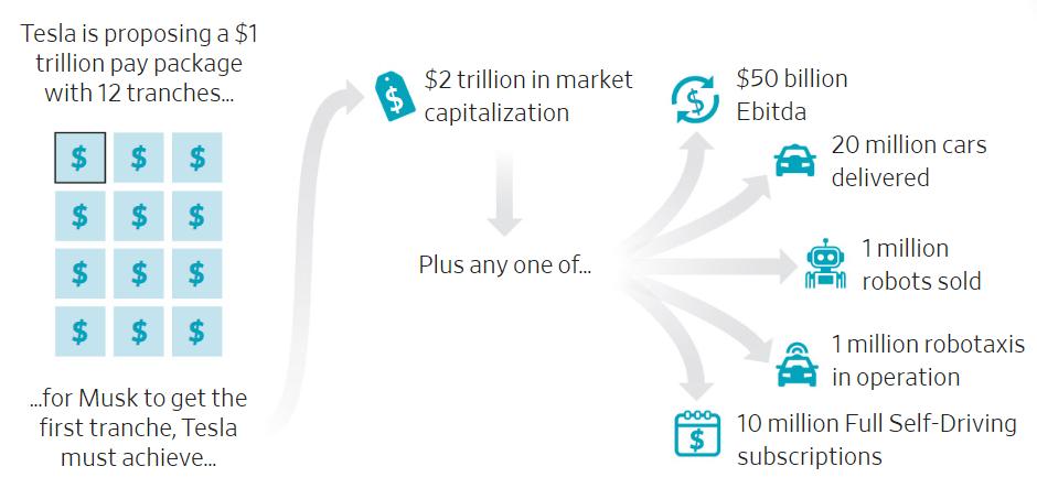 以1000亿美元(约7130亿元)市值为起点,每批要求特斯拉市值涨500亿美元,最终市值要达到6500亿美元。