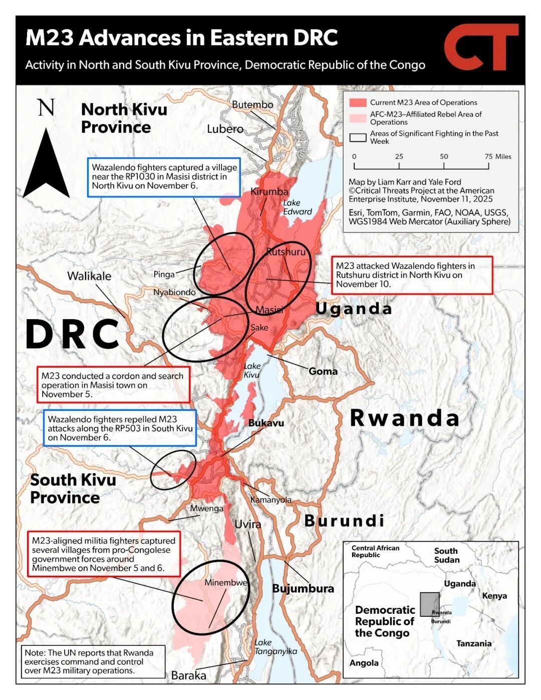 11月7日中国驻刚果(金)大使馆已多次发布安全提醒,明确指出刚果(金)东部的北基伍省、南基伍省、伊图里省、上韦莱省为极高风险地区,提醒中国公民切勿前往,已在当地的中国公民和机构应尽快撤离。