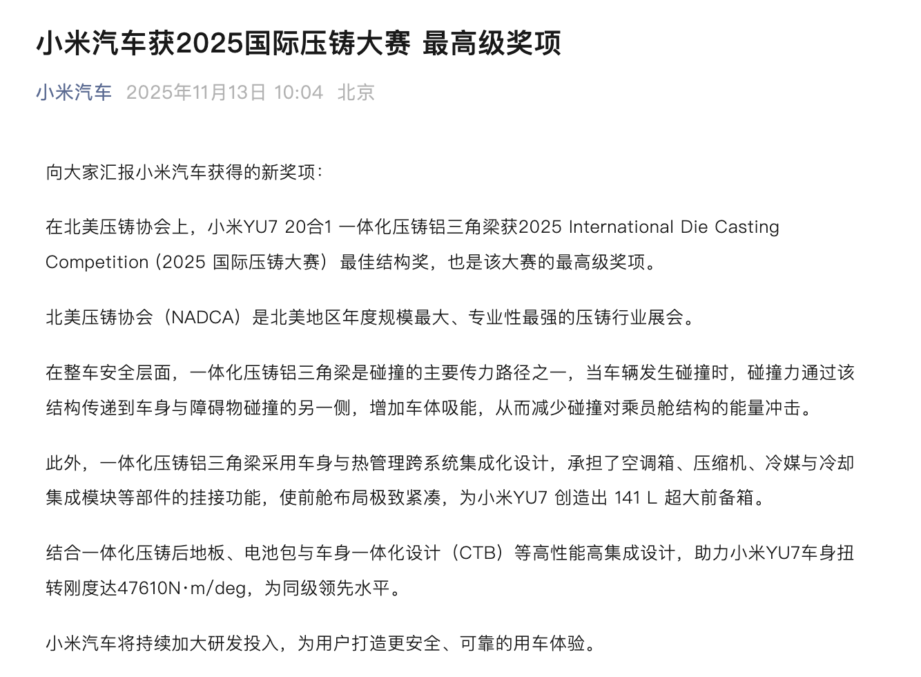 凤凰网科技讯,11月13日,小米汽车发文称,在北美压铸协会上,小米YU7 20合1一体化压铸铝三角梁获2025国际压铸大赛最佳结构奖,也是该大赛的最高级奖项。北美压铸协会(NADCA)是北美地区年度规模最大、专业性最强的压铸行业展会。