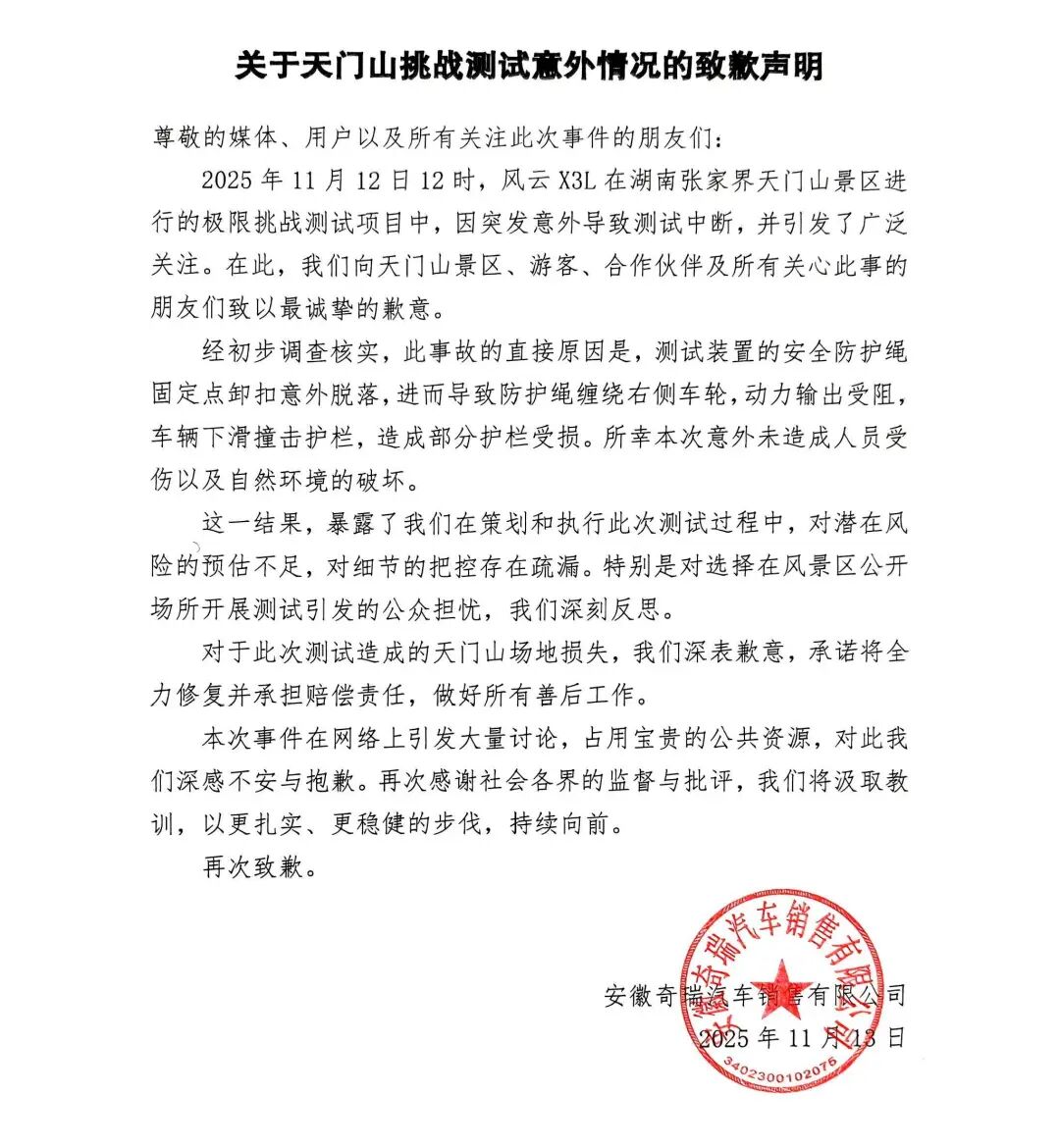 而在事故发生后,那份凌晨发布的致歉声明,更是让整件事变得耐人寻味。奇瑞将原因归结为「测试装置的安全防护绳固定点卸扣意外脱落」,试图将问题的焦点,从「车不行」引导向「工具不行」,从产品力不足转向执行疏忽。