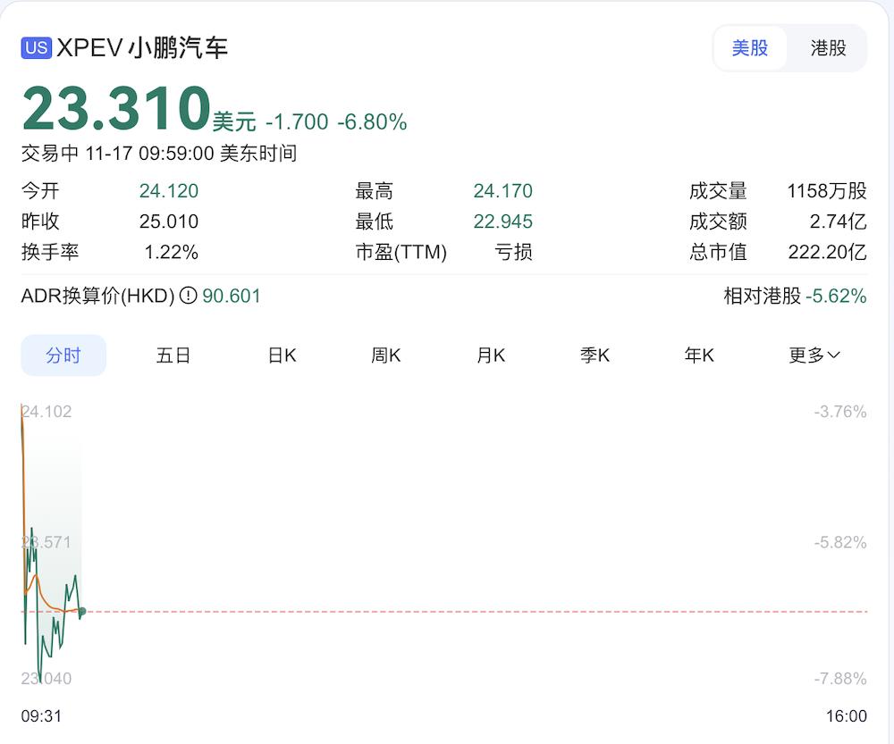 小鹏汽车业绩表现也辐射到了资本市场,截至发稿前,小鹏汽车美股股价跌超6%,市值为222亿美元(约合人民币1578亿元)。