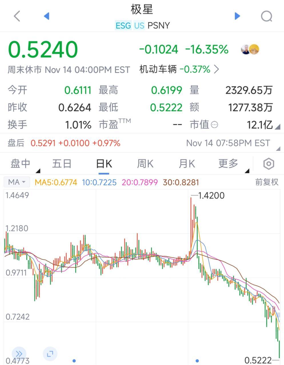 在今年6月,吉利控股集团董事长李书福向其注资2亿美元(约合人民币14.2亿元)进行股权投资试图“救火”,彼时极星汽车股价为1.06美元。仅上述这笔“加仓”投资,李书福5个月时间内浮亏已超50%。