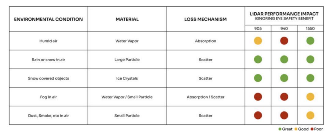 汽车是激光雷达应用领域中最具挑战性的应用之一,它既需要低成本的解决方案,又需要对性能有极高的要求,这带来了一些极具挑战性的设计考量。低性能激光雷达和高性能激光雷达之间的一个关键区别在于波长,即所用光的“颜色”。对于汽车激光雷达而言,有三个因素会受到所选波长的显著影响: