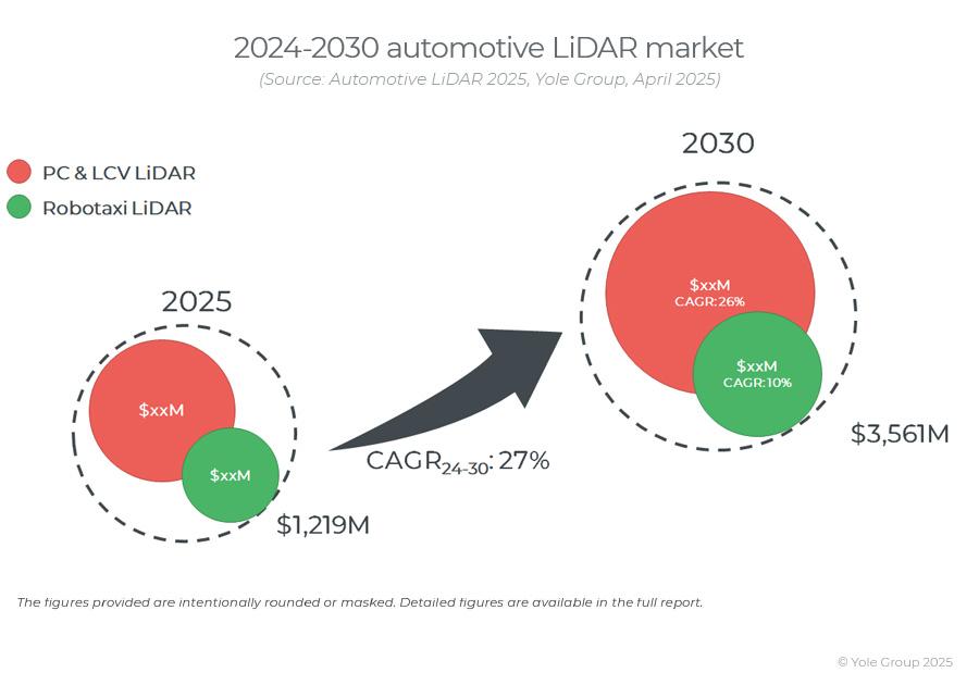 据Yole在今年三月的一份报告中称,全球汽车激光雷达市场预计将从2024年的8.61亿美元增长到2030年的38.04亿美元,2024年至2030年间的复合年增长率(CAGR)为28%。2022年,乘用车和轻型商用车(PC&LCV)市场与无人驾驶出租车市场处于交汇点;而到了2024年,PC&LCV的激光雷达市场规模将是无人驾驶出租车市场的四倍多。