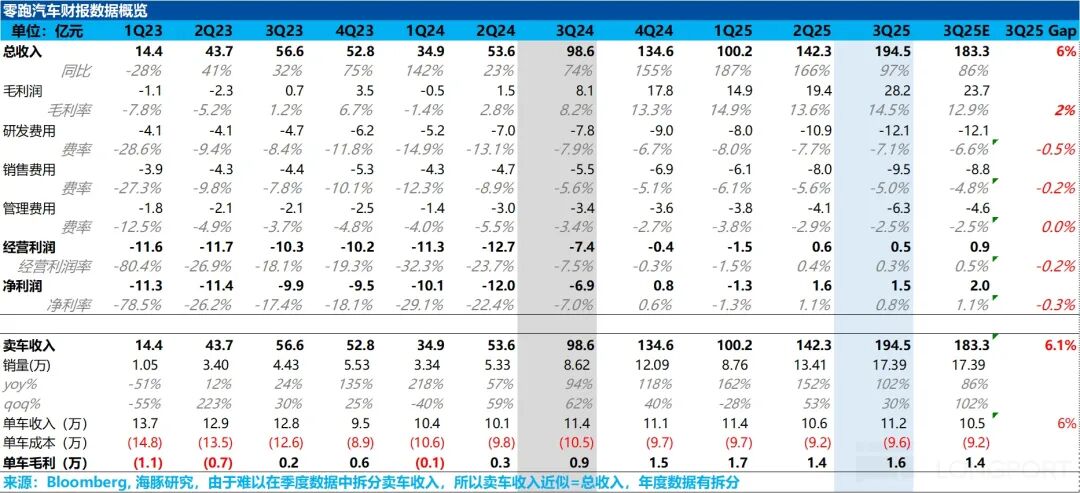 整体而言,零跑三季度的总收入和毛利率表现都不错,继续环比改善,双双超出市场预期,但净利润由于三费的环比大幅上行反而被侵蚀,呈现环比下滑趋势,同样也低于市场预期的 2 亿元。