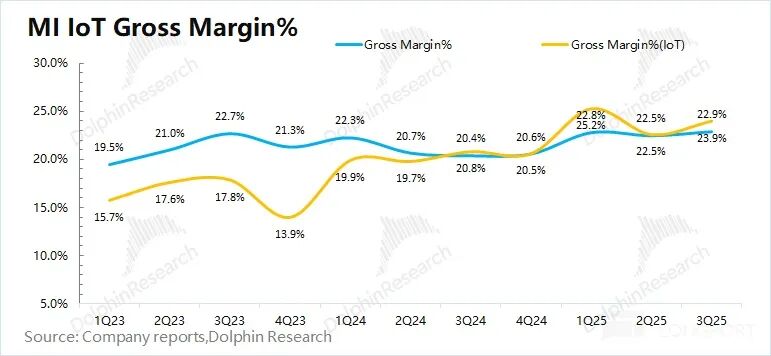 2025 年第三季度小米 IoT 业务实现营收 276 亿元,同比增长 5.6%。受国补退坡的影响,IoT 业务中的大家电品类出现两位数的下滑,直接影响了 IoT 业务的增速表现。