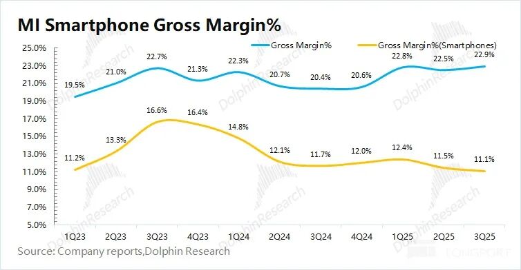 小米集团 2025 年第三季度毛利率 22.9%,市场预期 22.7%。其中本季度手机业务毛利率在本季度再次下滑,汽车是毛利率提升的最大贡献项。