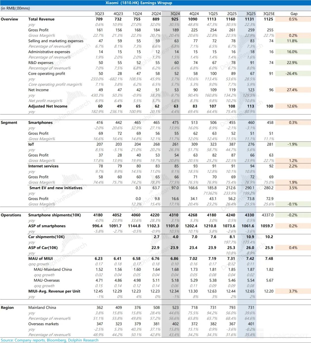 小米集团于北京时间 2025 年 11 月 18 日晚的港股盘后发布了 2025 年第三季度财报(截止 2025 年 9 月),要点如下: