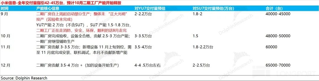 当前小米汽车业务仍然有大约 40 万辆的积压订单,依然是 “供不应求” 的局面。当前主要关注公司的产能爬坡情况,从 10 月交付量来看,公司当前合计月产能已经达到 5 万辆左右,预估小米汽车在 2025 年末/2026 年初有望达到 7 万辆的月产能,进一步加快 “积压订单” 的交付。