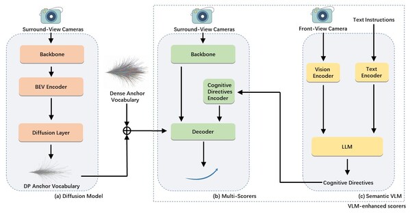 浪潮信息AI团队提出了SimpleVSF框架,其核心创新在于引入了视觉-语言模型(VLM)作为高层认知引擎,并设计了双重融合策略,将VLM的语义理解能力高效地注入到轨迹评分与选择的全流程中。