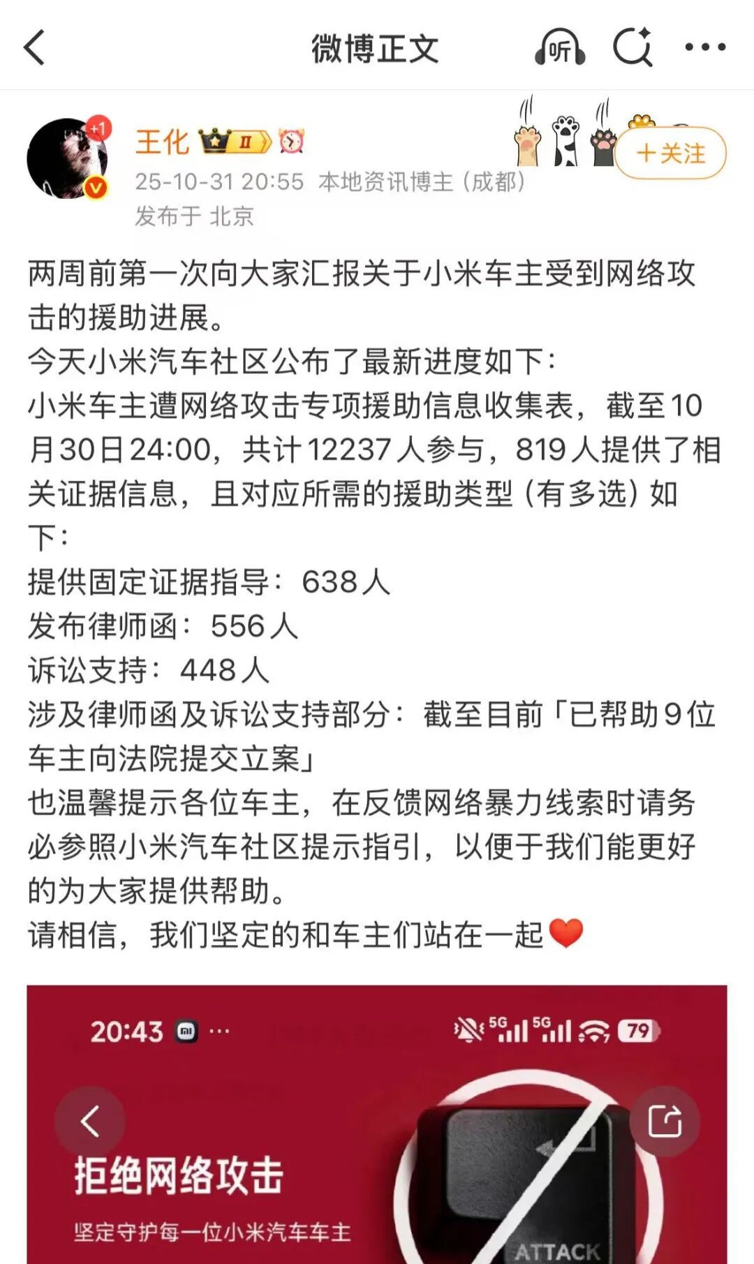 王化也对小米车主受到网络攻击的事件十分敏感,其曾在今年10月通报了小米车主受到网络攻击的进展,称截至10月15日24:00,共计有6032人参与了小米车主遭网络攻击转向援助的信息收集,并对应向其中的用户提供固定证据指导、发布律师函、诉讼支持三项援助。