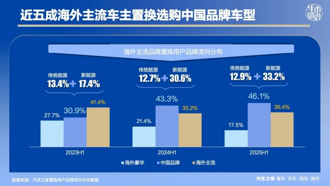 据汽车之家置换用户数据来看,海外品牌用户同阵营置换的比例正在快速下滑,由2023H1的27.7%,至2025H1的17.5%,两年的时间下滑了10.2个百分点。其中,主要流失去向为中国品牌新能源阵营。