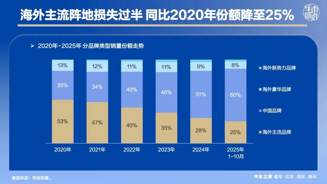 据终端销量数据显示,2020年至今,海外主流品牌的市场份额连年下滑,至2025年1-10月份额仅剩25%,相比2020年的53%,阵地损失超半数。