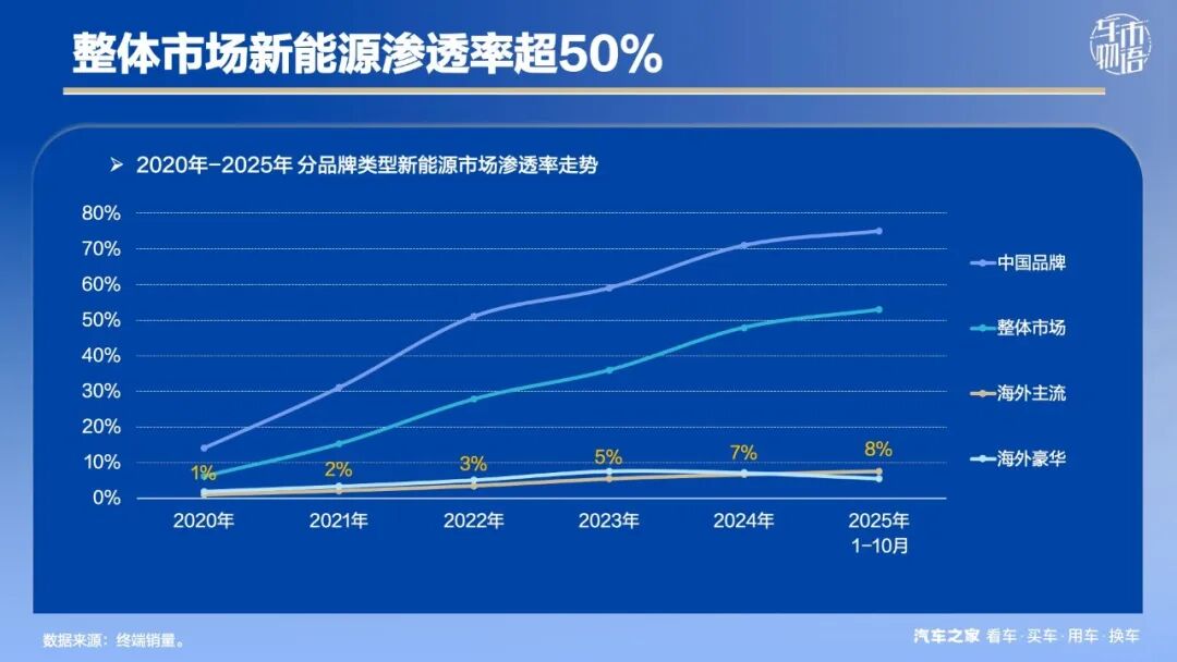 得益于政策扶持、产品技术不断提升,中国新能源汽车市场飞速发展,至2025年整体市场新能源渗透率已经超过50%,其中中国品牌遥遥领先,渗透率接近80%,而海外主流仍未突破10%。