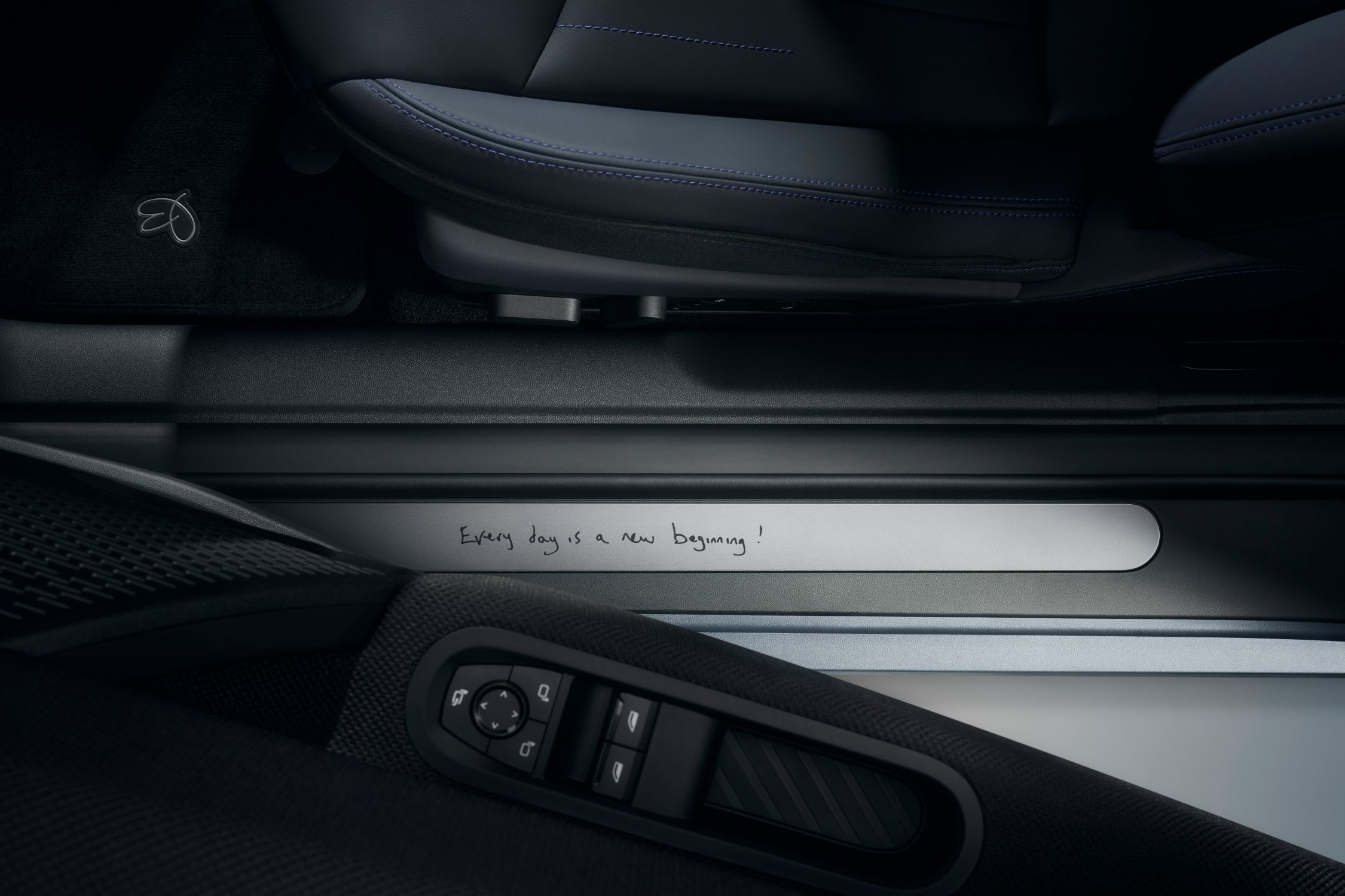 此外,车辆开门时地面会投射Paul Smith手写的“Hello”字样,门槛刻有设计师手写的“Every day is a new beginning”字样,地垫印有手绘兔子图案。中央圆形显示屏在个性模式下提供三种Paul Smith专属背景。