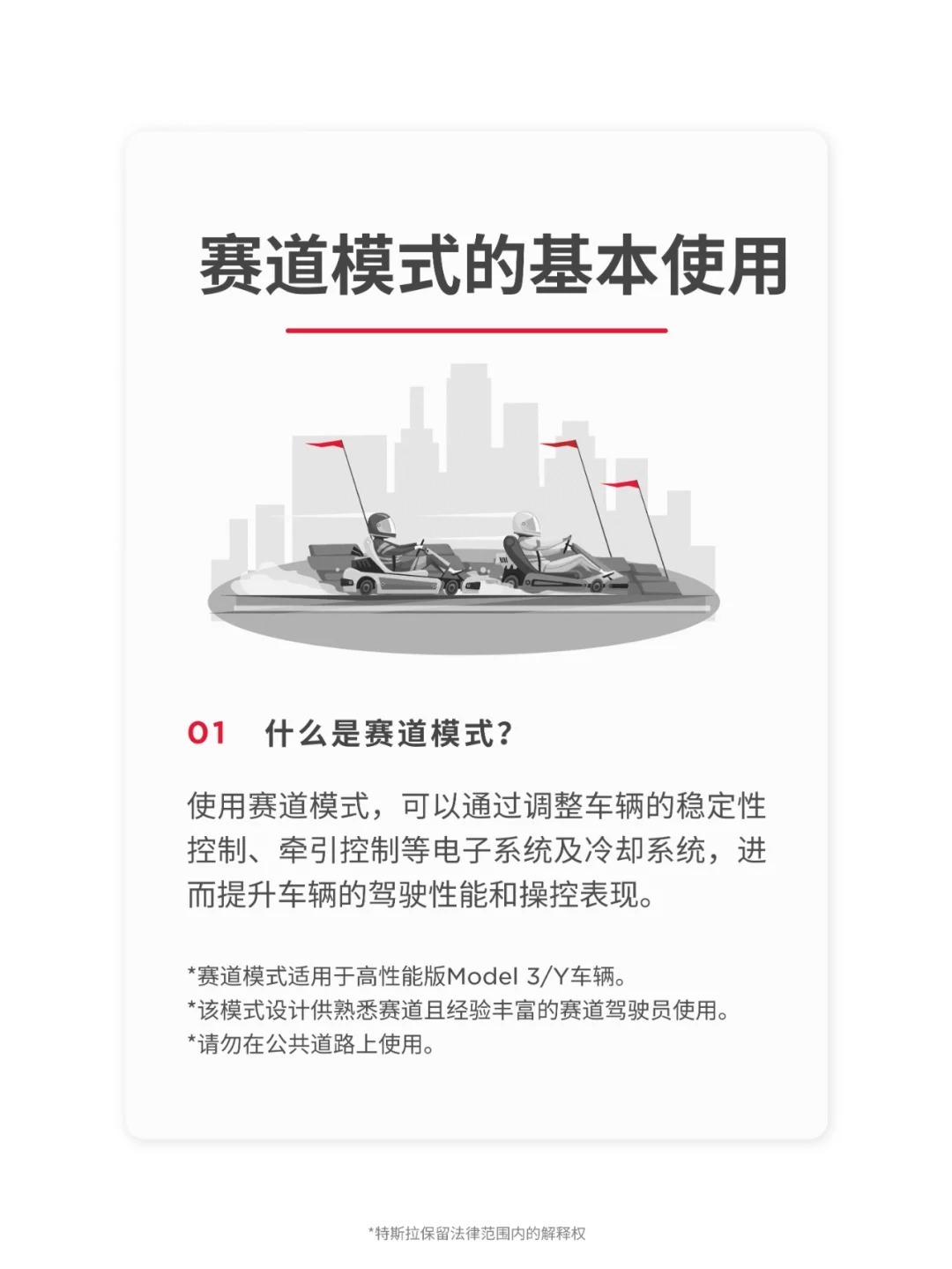 但36氪发现,特斯拉Model 3/Y Performance在「赛道模式」中提供了动力自由分配、稳定性控制等选择,用户可以选择460匹马力全由后轮输出、同时关闭ESP电子车身稳定系统。出于安全考虑,特斯拉在启动界面已标注该模式供经验丰富驾驶员使用,并提醒请勿在公开道路使用。