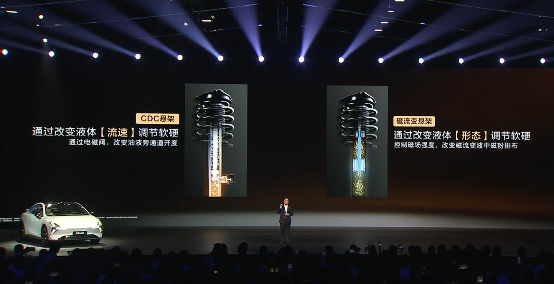 “磁流变真正意义上,它跟传统原理完全不一样,”彭钱磊解释道,“实际上就像水跟冰晶可以无缝切换,大家看过一部电影叫《毒液》,或者现在网上有一个很流行的词是叫‘非牛顿流体’,看上去很软,但是你使劲砸它的时候,它又很硬。”他将其体验价值总结为四句话:“飞坡不跳”、“过弯不偏”、“刹车不点头”、“起步不抬头”,并形象地称之为“公路磁悬浮”。