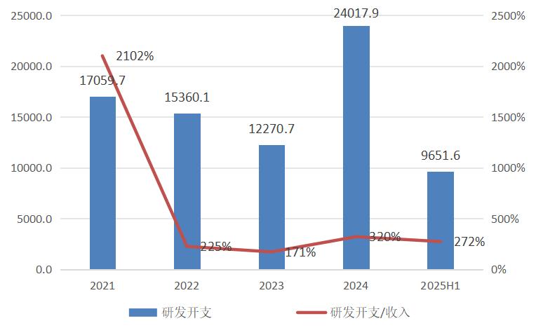 文远知行从2021年到2025年上半年的研发开支总和达到39.96亿元人民币,超过净亏损的一半,且研发开支与收入的比重达到245%。