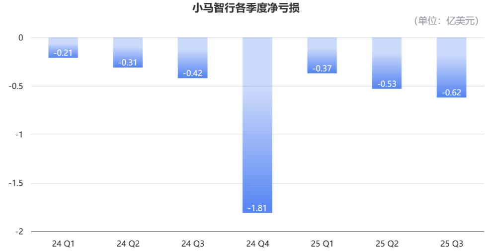 在净亏损层面,小马智行Q3净亏损为6157万美元(约4.36亿元),高于去年同期的4211万美元,也高于5326万美元;经调整后的净亏损约为5500万美元,也同比扩大33%。