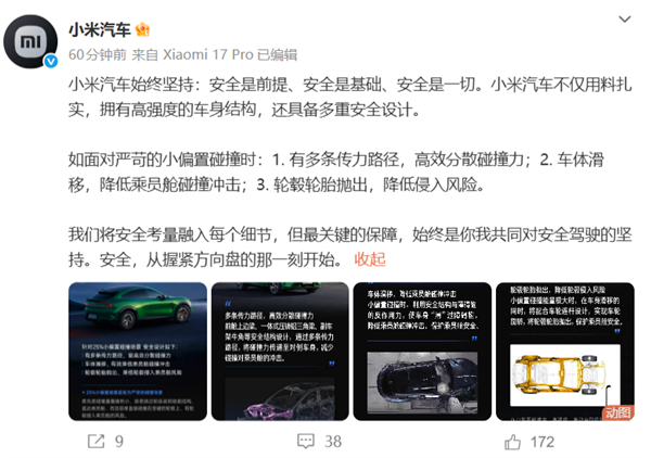 “我们将安全考量融入每个细节,但最关键的保障,始终是你我共同对安全驾驶的坚持。安全,从握紧方向盘的那一刻开始”,小米汽车表示。