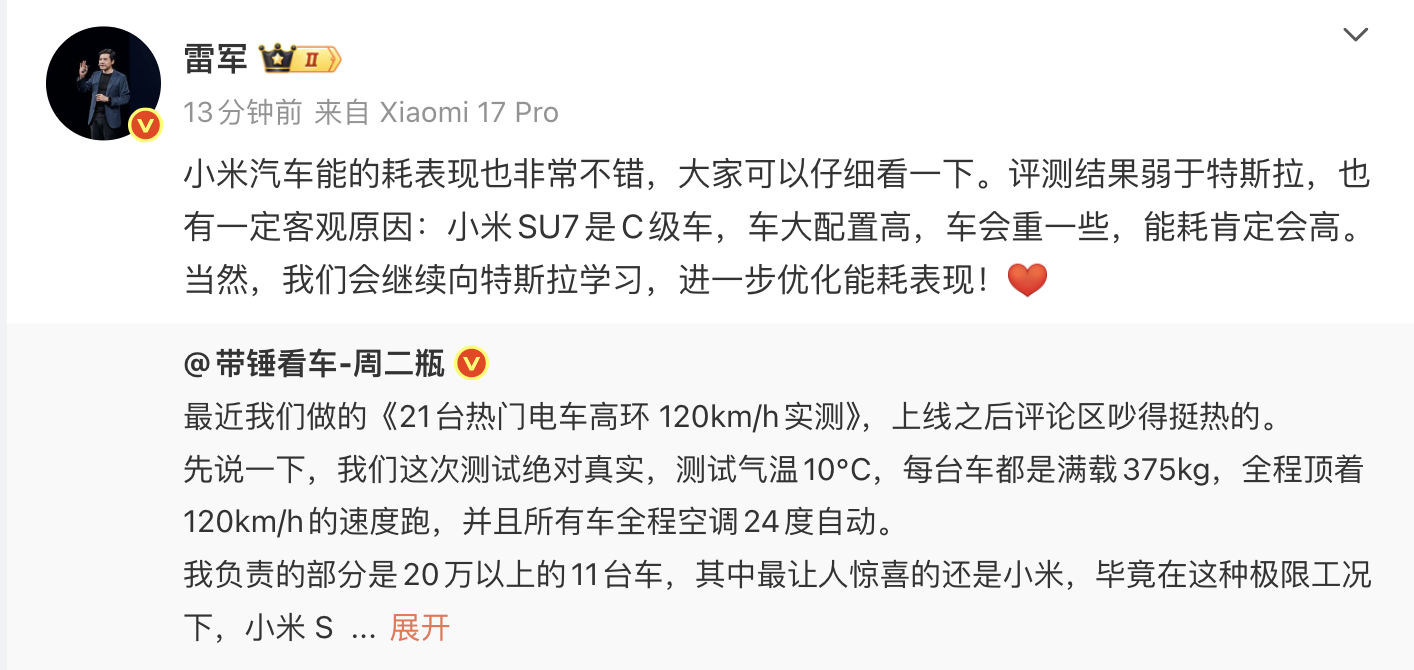 凤凰网科技讯 11月28日,雷军发微博称:小米汽车能的耗表现也非常不错,大家可以仔细看一下。评测结果弱于特斯拉,也有一定客观原因:小米SU7是C级车,车大配置高,车会重一些,能耗肯定会高。当然,我们会继续向特斯拉学习,进一步优化能耗表现。