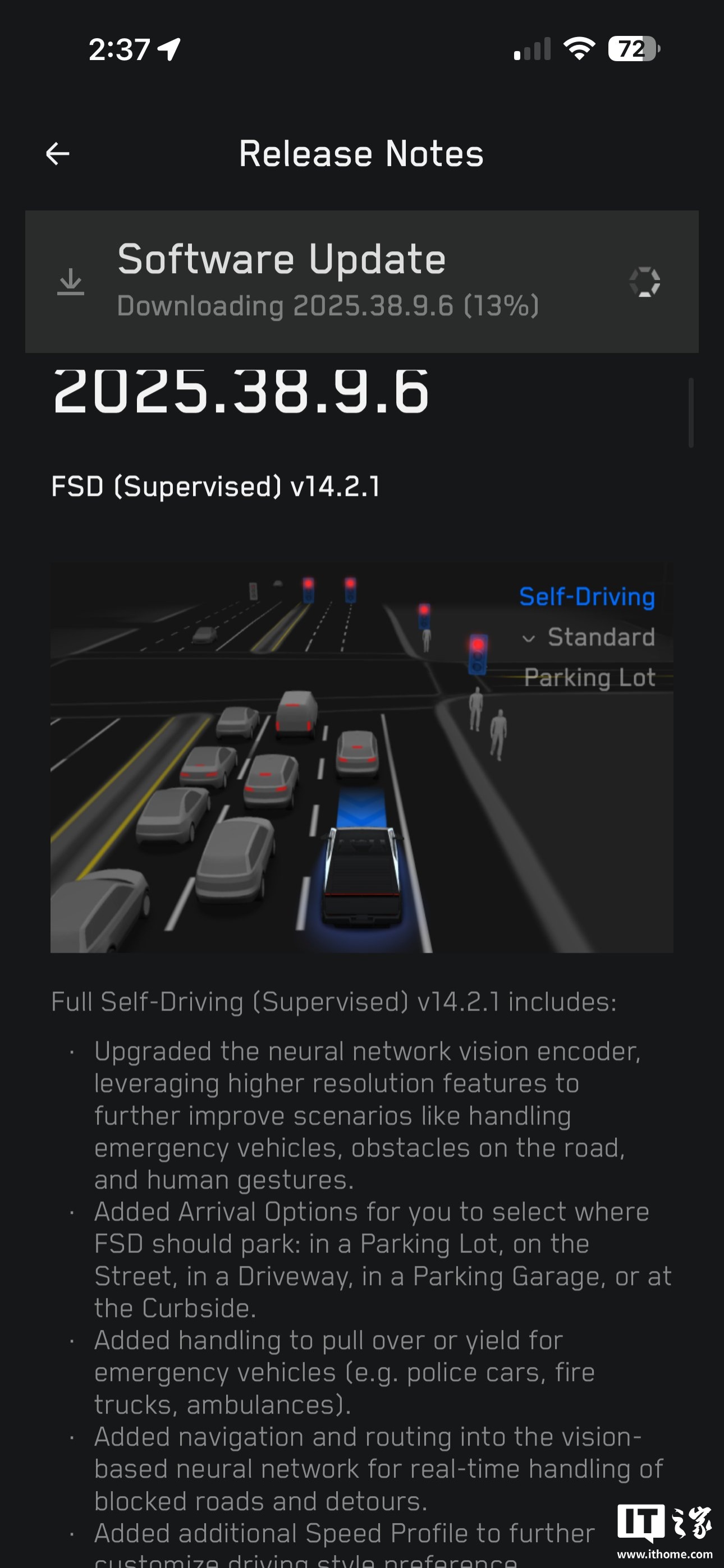 IT之家注意到,有关 FSD V14.2.1 的首批用户反馈已陆续出现在社交平台 X 上。据车主反映,V14.2.1 似乎是一次小更新(point update),旨在进一步打磨与优化已在 FSD V14 中引入的各项功能与性能。然而,查阅该版本的更新说明后可发现,其中新增了一条额外信息: