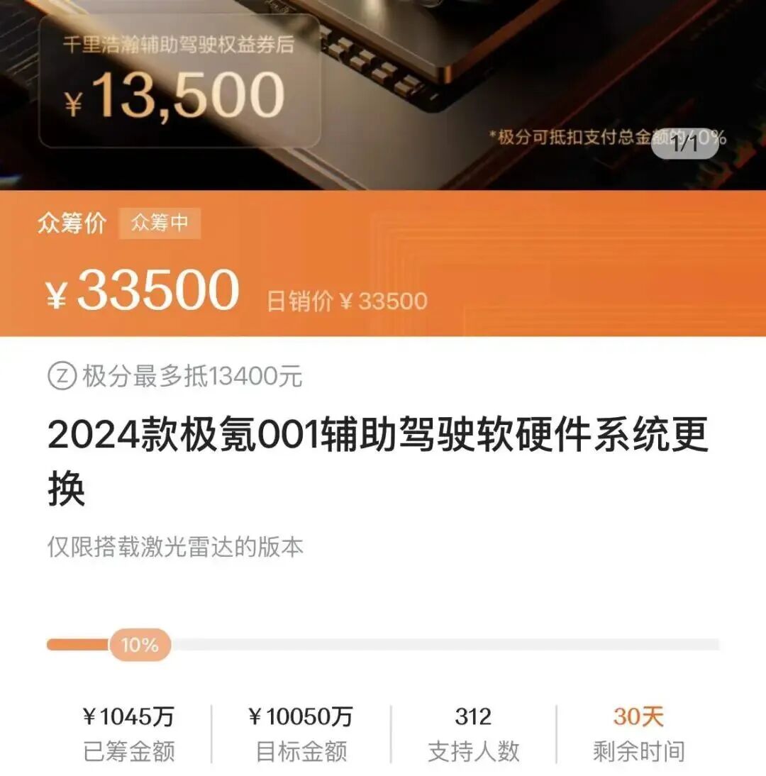 极氪001车主实际需支付款项13500元,目标3000人;极氪009车主需支付18500元,目标人数为1500人。参与众筹人数达到目标数量,极氪将启动对应车型的软硬件系统更换的开发和验证工作。这样的大跨度升级并不多见,价格区间也被夸赞“有诚意”,但不少车主仍不买账。