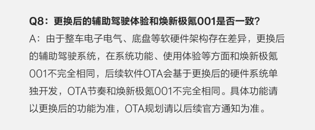 这种差异极氪在最新公告中也明确告知:由于整车电子电气、底盘等软硬件架构存在差异,更换后的辅助驾驶系统,在系统功能、使用体验等方面和焕新极氪001不完全相同,后续软件OTA会基于更换后的硬件系统单独开发,OTA节奏和焕新极氪001不完全相同。