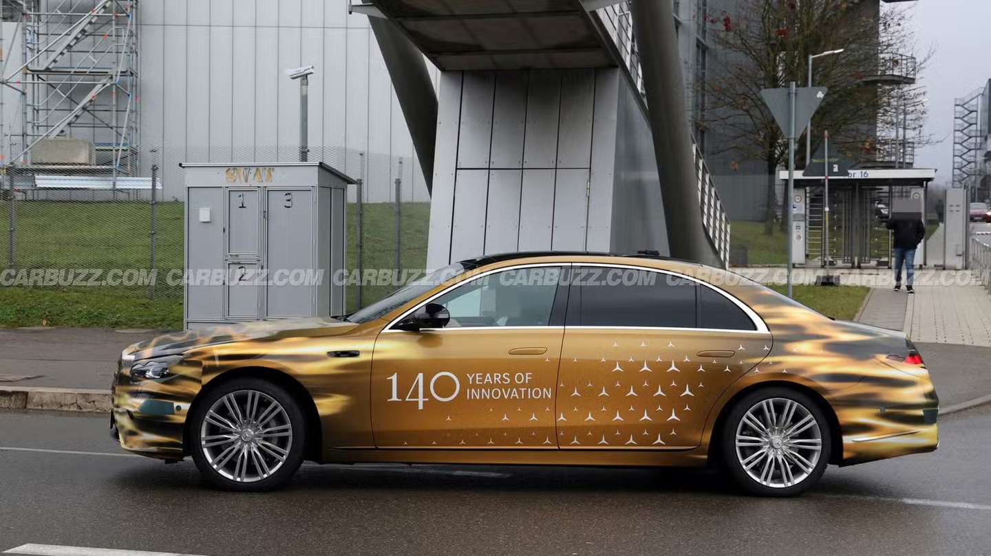 IT之家 11 月 29 日消息,汽车媒体 CarBuzz 昨日(11 月 28 日)发布博文,分享了一组抓拍的路测图,展示了梅赛德斯-奔驰为 140 周年筹备的 S 级轿车原型车,车身上覆盖有金色的火焰伪装膜。