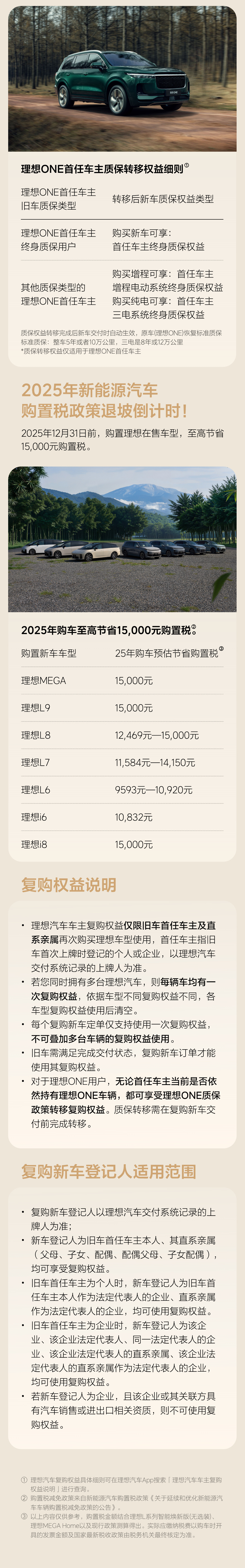 根据理想汽车公告,在 2025 年 12 月 31 日前,理想汽车全系首任车主购置新车可享受差异化权益: