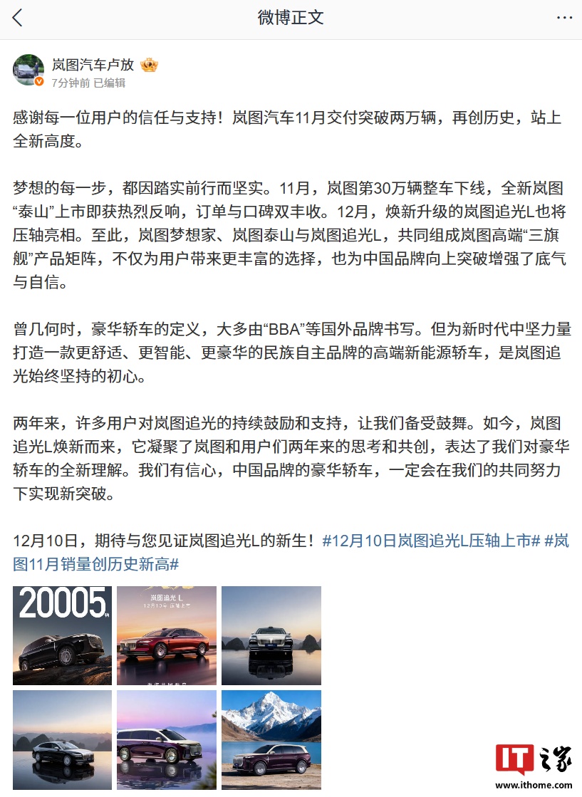 IT之家 12 月 1 日消息,岚图汽车科技股份有限公司董事长、总经理卢放今日宣布:岚图汽车 11 月交付突破两万辆,再创历史,站上全新高度。