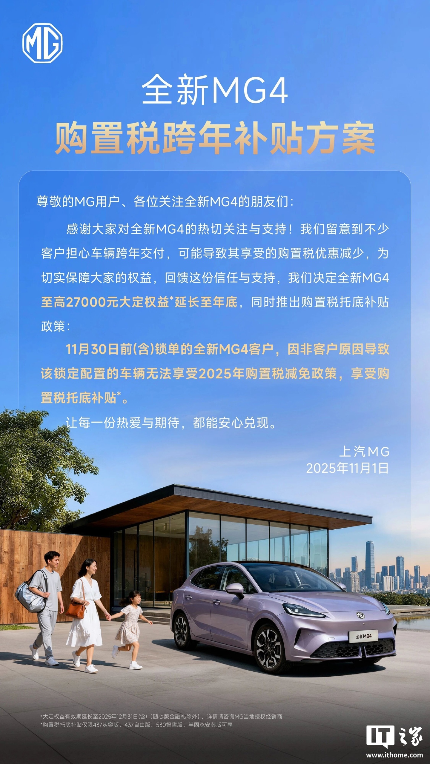IT之家 12 月 1 日消息,上汽 MG 今日宣布,全新 MG4 汽车购置税托底补贴从 11 月 30 日延至 12 月 28 日,锁单全新 MG4 437 从容版、437 自由版、530 智趣版、半固态安芯版的客户,因非客户原因导致该锁定配置的车辆无法享受 2025 年购置税减免政策,享受购置税托底补贴。