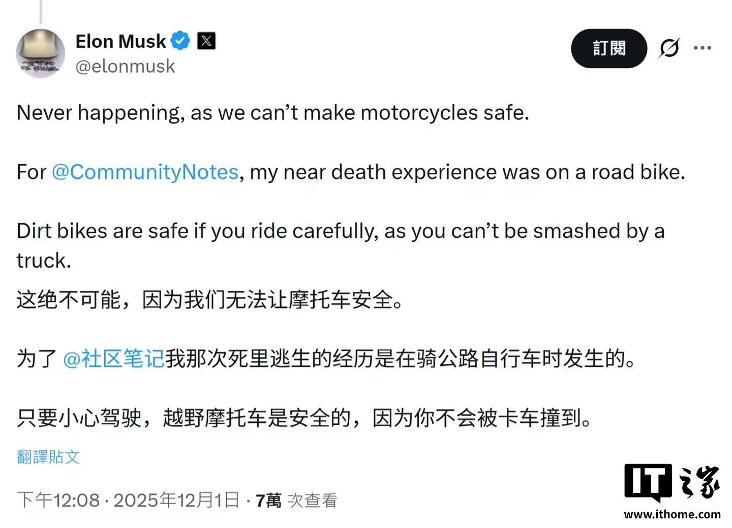 IT之家 12 月 1 日消息,X 平台用户 @Moandbhr 昨天发布了一段“马斯克骑单轮摩托车”的 AI 视频,并配文称“埃隆・马斯克先生刚发布了颠覆行业的特斯拉摩托车”,引发网友热议。
