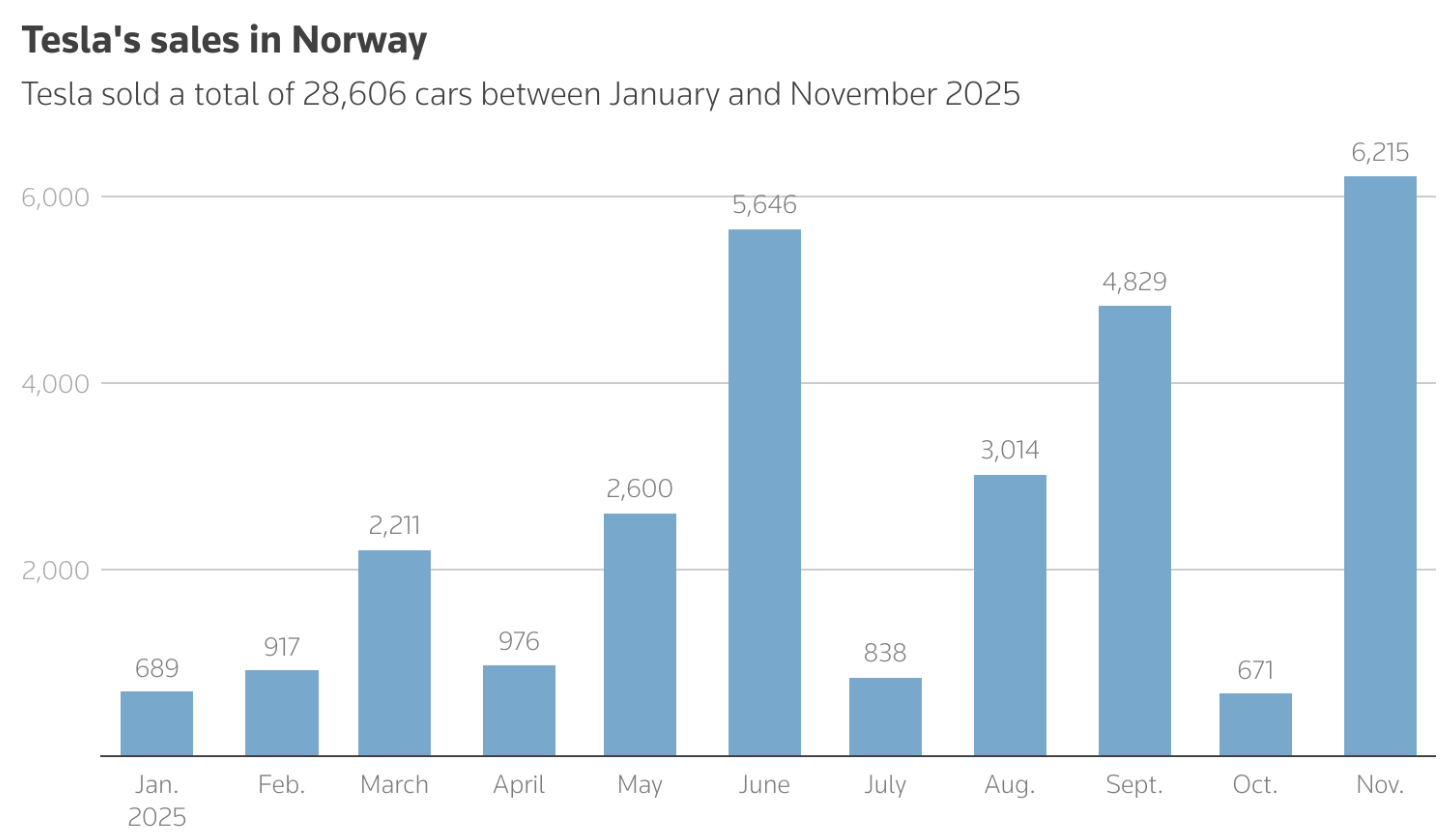 由于买家赶在明年1月电动汽车税上调之前蜂拥至经销商购车,挪威11月整体汽车销量同比上涨70%。其中,特斯拉的销量几乎是2024年11月的三倍。
