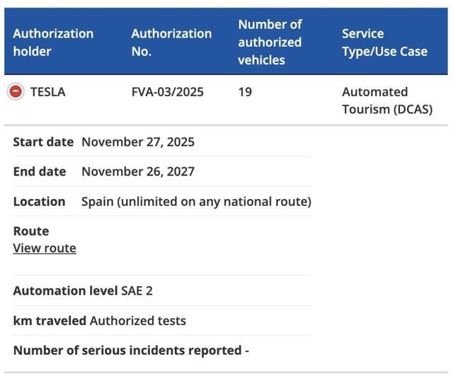 该项目的授权有效期为 2025 年 11 月 27 日至 2027 年 11 月 26 日。DGT 同时明确,特斯拉可在西班牙任何国家级道路开展不限次数的 FSD 测试。鉴于特斯拉目前已进入 ES-AV 计划的第三阶段,车上安全操作员已非强制要求,远程监控亦被允许。